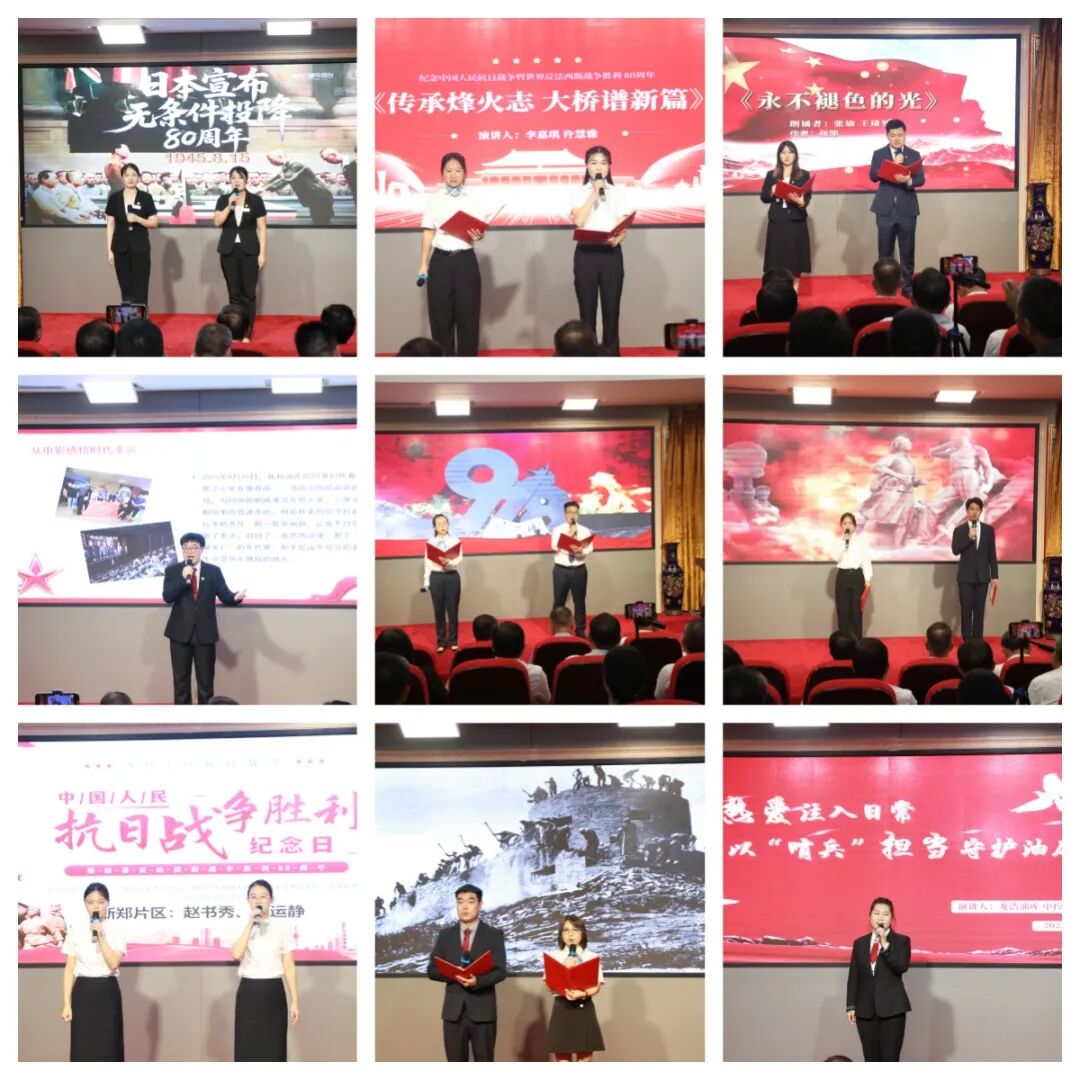 随着主持人宣布朗诵会正式开始,15 组参赛选手依次登台。来自河南诗词学会、大桥石化各分公司及协办单位的朗诵者们,以饱满情感、铿锵语调,演绎了一首首承载历史记忆与民族情怀的诗篇。京港澳高速原阳服务区周杏、刘娜带来的《铭记历史荣光 共筑大桥华章》,将企业发展与历史传承紧密联结;龙浩油库刘晨辉以演讲的形式讲述了《幸运小人物映见时代大幸福》,从微观视角传递时代温度;河南省诗词学会宋玉娟、胡守明演绎的〔双调・雁儿落带得胜令〕《抗日烽烟遍太行》等组诗,用古典诗词韵律重现抗战烽火;大桥石化集团党委副书记冯江新、人事部部长张军晖朗诵了,由张贵林书记编写的《站在历史的刻度上》,从时代视角解读抗战精神的当代意义。此外,河南省中小企业协会于莉、李昶君的《胜利的黎明》,郑州市成品油流通行业协会唐永超、秦翠连、李倩的《八秩回响,油路长歌》,河南省石油业商会秘书处晋升、韩笑的《时间的勋章》等作品,或慷慨激昂、或深沉婉转,每段朗诵都如一束光,照亮历史角落,让现场观众在字句间重遇英雄群像,感受民族脊梁的力量。集团总部办公室甄亚鸽、陈梦雅朗诵的,由冯江新副书记编写的《丰碑映山河》压轴登场,以深沉真挚的情感回望历史丰碑,为整场朗诵画上圆满句点。