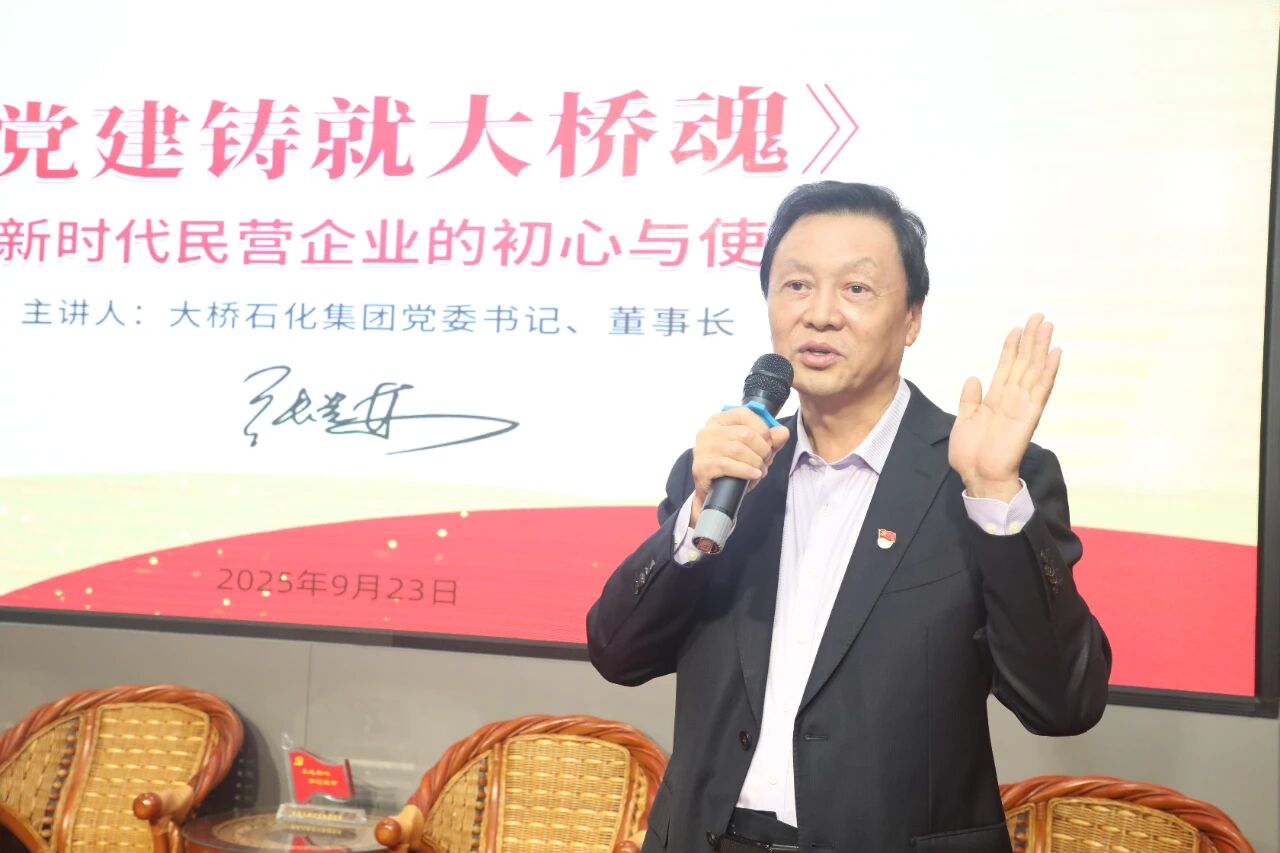 雨丝连绵不绝,却挡不住新疆生产建设兵团第十四师昆玉市青马工程培训班一行参观大桥石化红色家园的脚步,学习党建知识的热情比窗外的风雨来的更坚定。2025年9月23号下午,新疆生产建设兵团第十四师昆玉市青马工程培训班一行64人在团委负责人梁乐初的带领下,千里迢迢来到大桥石化参观学习,大桥石化集团党委书记、董事长张贵林出席本次活动并为大家分享了《党建铸就大桥魂——新时代民营企业的初心与使命》微党课