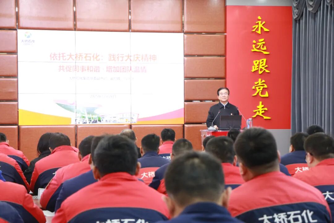 2025年12月26日,正值毛泽东同志诞辰 132 周年纪念日,当晚七点,郑州红色家园教育基地教课室灯火通明、氛围浓厚,大桥石化2025年度最后一场夜校培训课在此温情落幕。集团党委副书记、副总裁冯江新以《依托大桥石化:践行大庆精神·共促同事和谐·增加团队温情》为主题,为郑州区域加油站片区经理及站长、集团总部办公室、花园路居住人员等70余人带来了一场兼具思想深度与情感温度的专题收官培训,在缅怀伟人、传承精神的特殊日子里,为全体学员注入奋进力量。